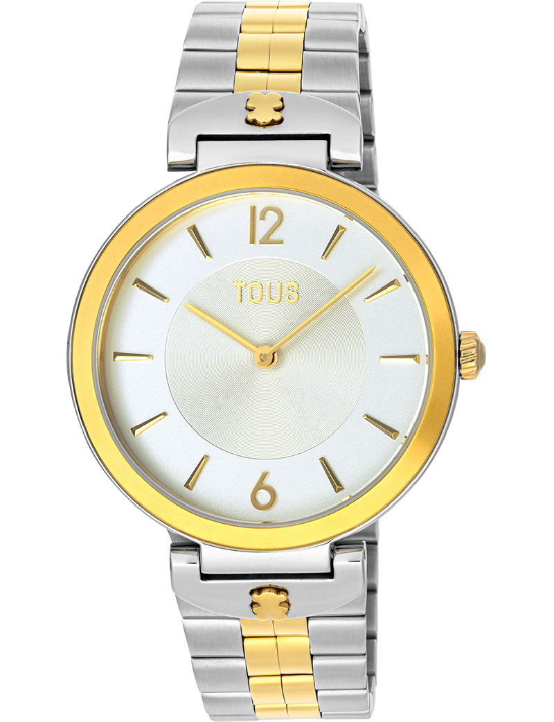 Relógio analógico TOUS S-Band com bracelete em aço e aço IPG dourado 316L, diâmetro de 36 mm e mostrador em metal. Funções: horas e minutos. Impermeável a 3 ATM. Bateria: 1,55 V, óxido de prata SR621SW/0,3 gramas. Movimento de quartzo japonês. Fecho desdobrável com botões.